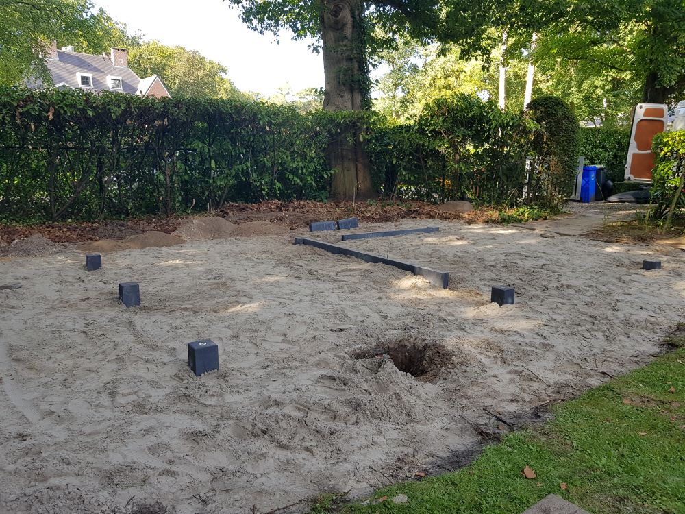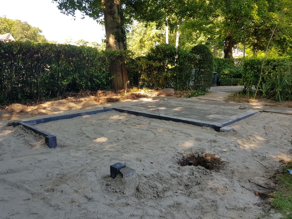 Een duurzame constructie begint bij een stevige basis. Daarom hebben wij gekozen voor een fundering van betonpoeren en opsluitbanden. Deze zorgen voor optimale stabiliteit en een lange levensduur van het tuinhuis en de overkapping.