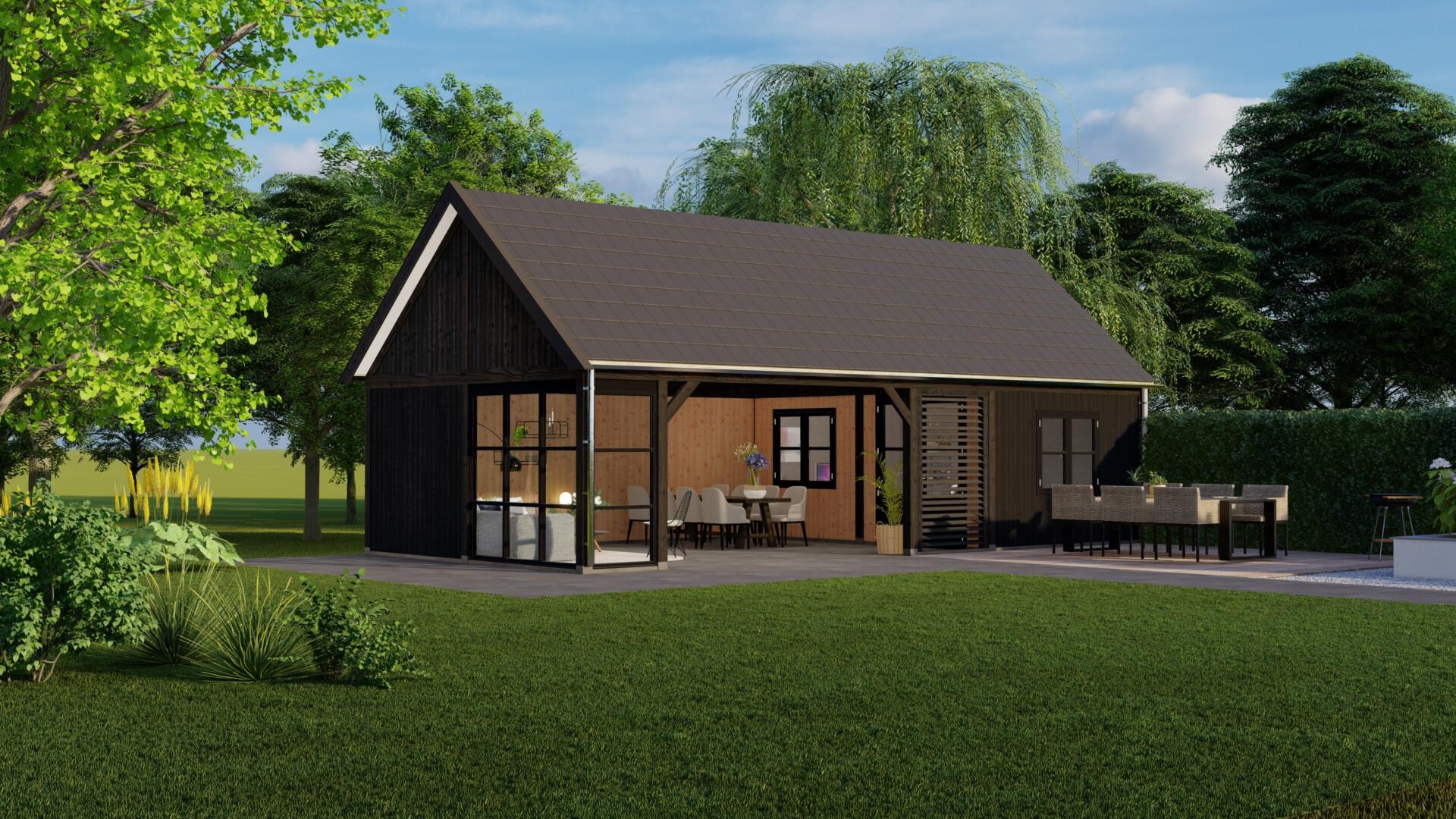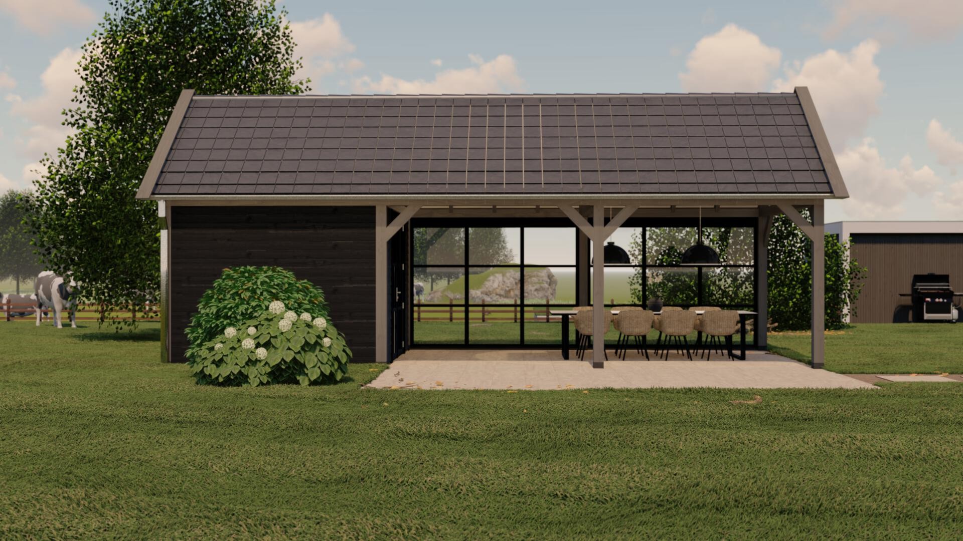 Een kapschuur herkent u aan de ongelijke dakvlakken, waarbij de achterzijde langer is en lager doorloopt. Dit zorgt voor een robuust en sfeervol ontwerp dat perfect past bij zowel landelijke als moderne tuinen.
