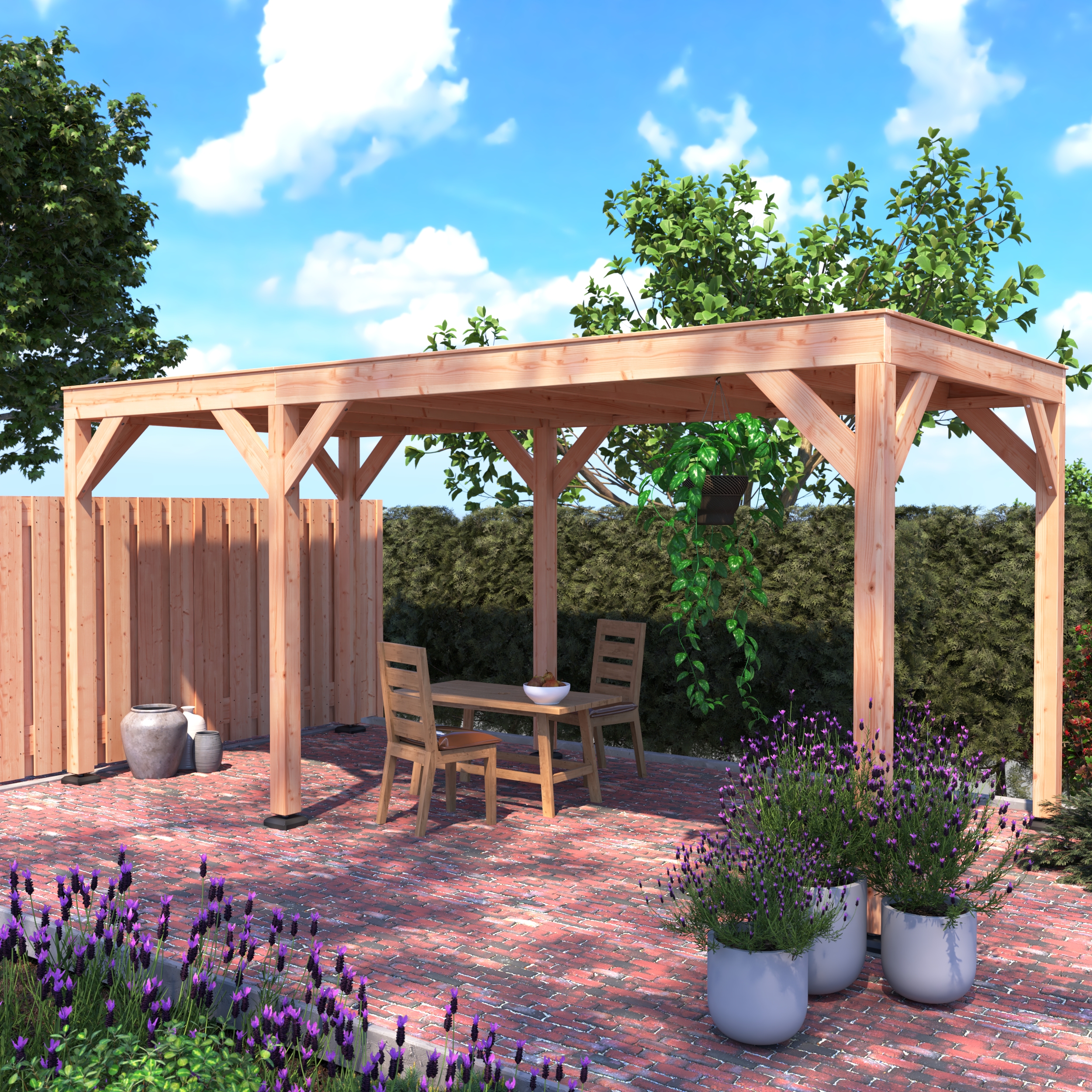 Er zijn verschillende stijlen van Douglas overkappingen, met de meest voorkomende types de plat dak overkapping en de zadeldak overkapping. Een plat dak geeft een moderne uitstraling. Het is ook eenvoudiger te monteren en je hebt er minder materiaal voor nodig. Aan de andere kant biedt een zadeldak meer ventilatie en kan het beter zijn in het afvoeren van regenwater.