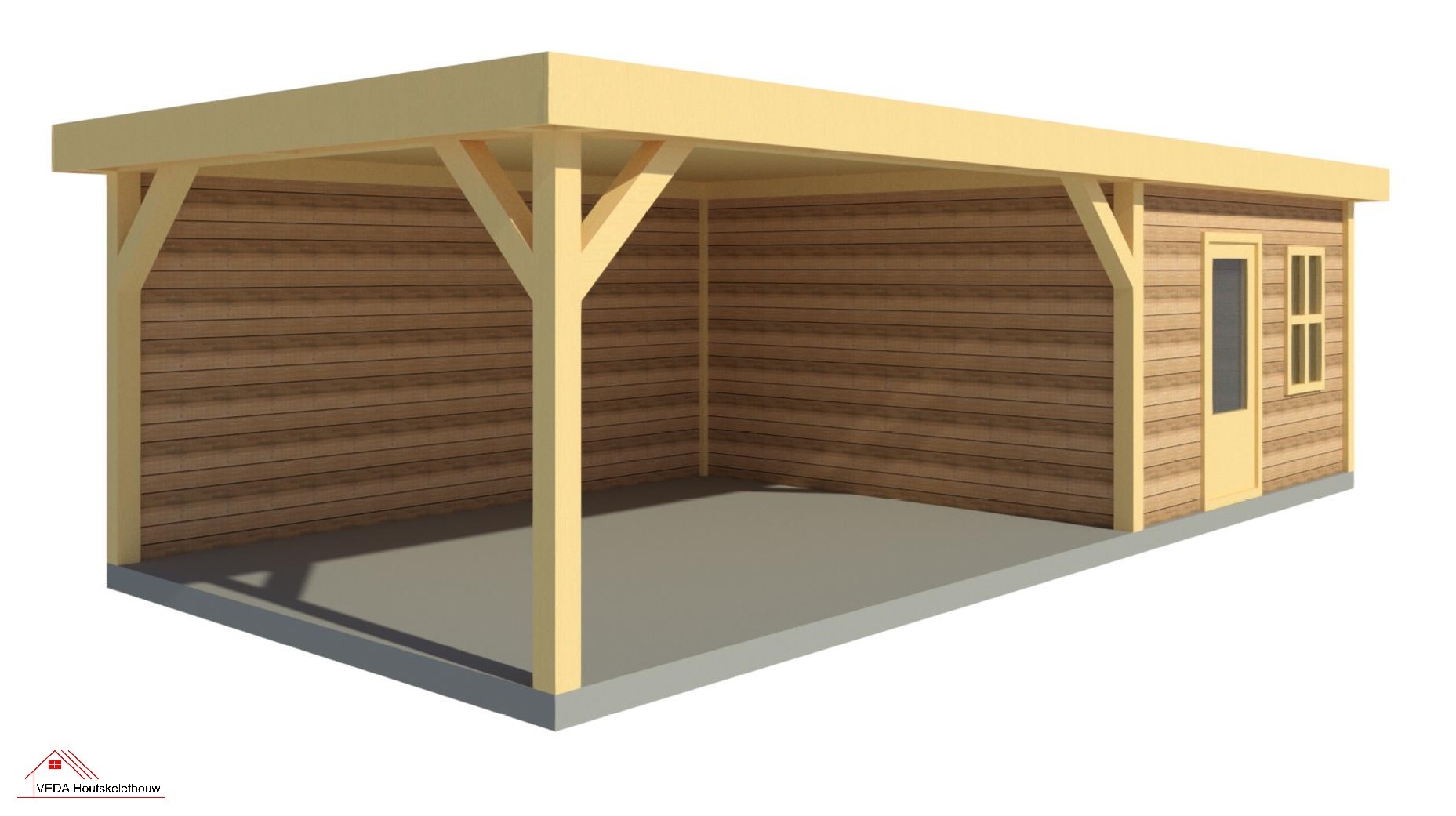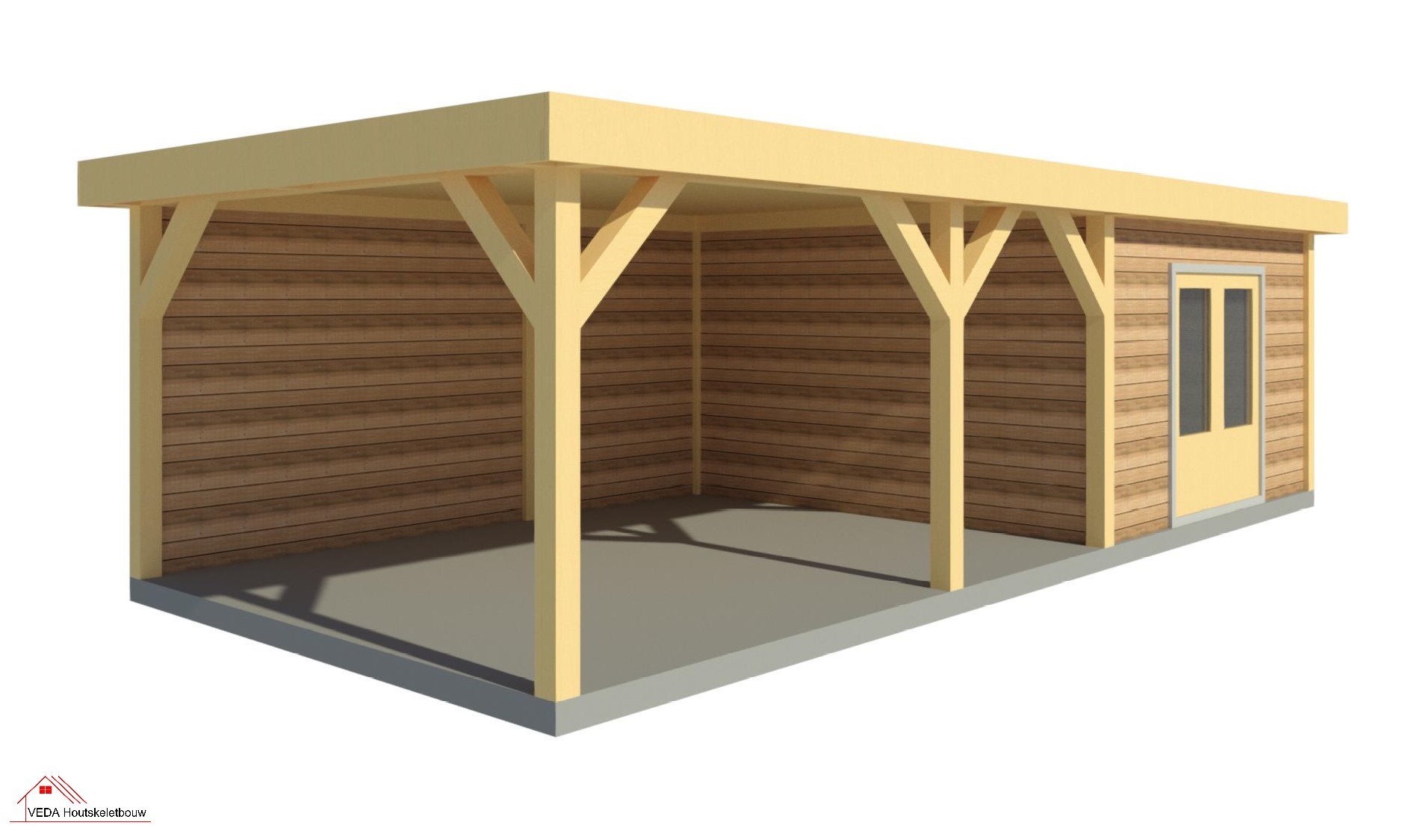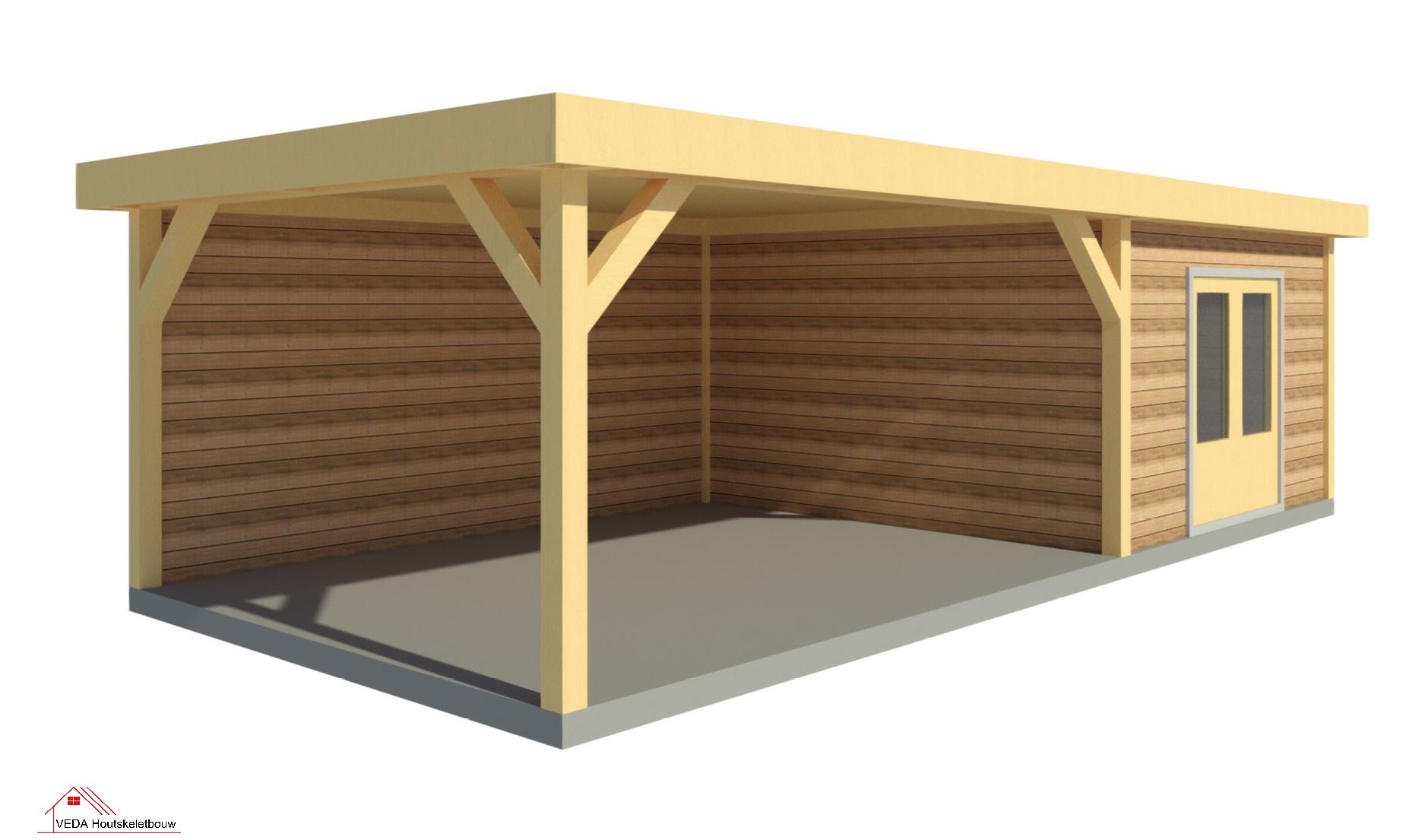 De overkapping kan van hetzelfde Douglas hout gemaakt zijn als het tuinhuis, maar er zijn ook opties met bijvoorbeeld aluminium elementen voor een modernere look.