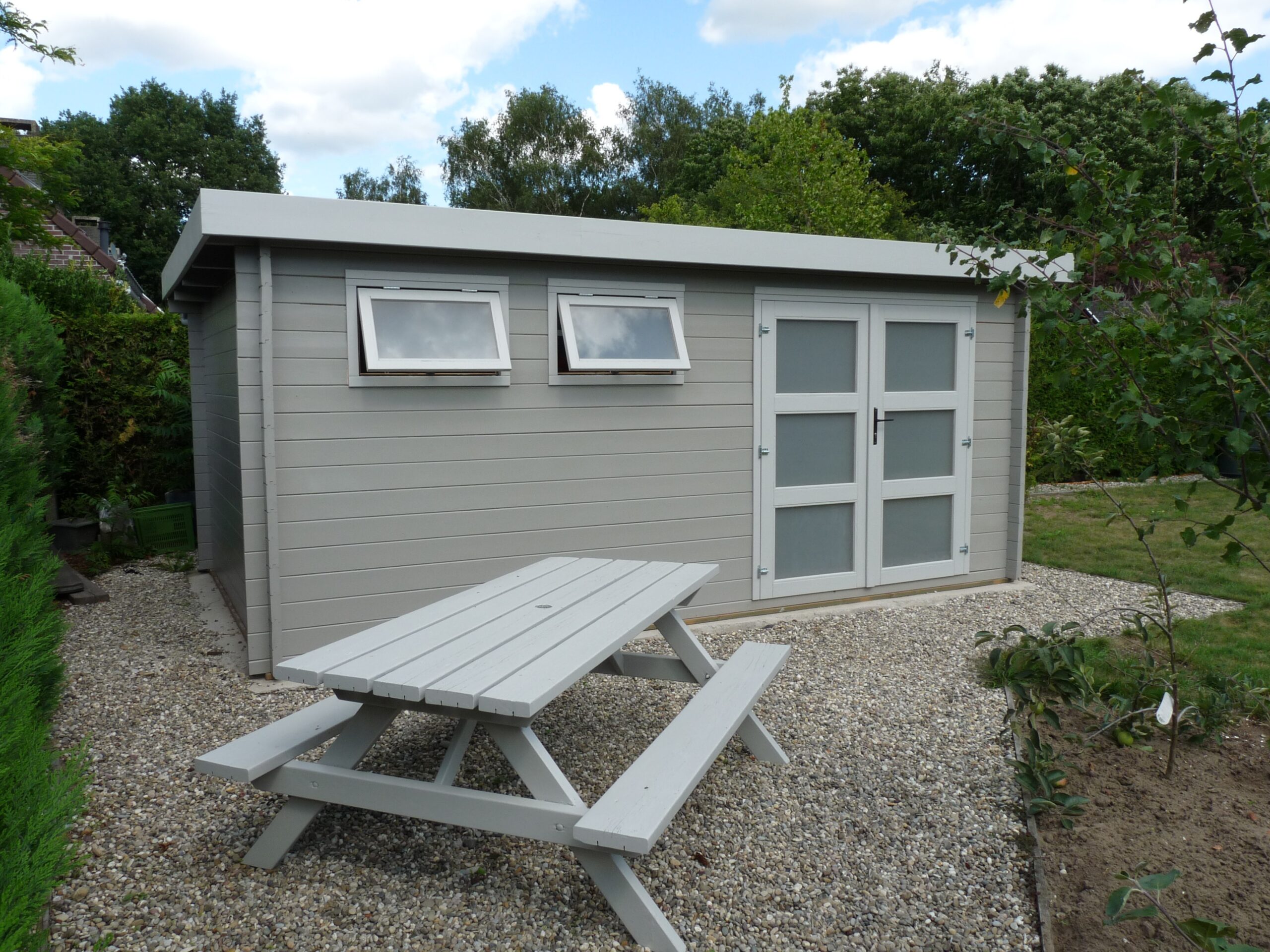 Een plat dak biedt veel voordelen vergeleken met traditionele zadeldaken. Ten eerste, de constructie van een blokhut met een plat dak is vaak eenvoudiger en daardoor goedkoper. Dit maakt het aantrekkelijk voor degenen die een scherpe prijs zoeken. Daarnaast zorgt een plat dak voor een modernere uitstraling, die perfect aansluit bij een strakke tuinarchitectuur. Zo creëer je ook een handige extra ruimte, waardoor je bijvoorbeeld een terras of dakterras kunt aanleggen. Jouw tuinhuis met plat dak wordt compleet geleverd als bouwpakket. Tuinartikelenoutlet levert ook maatwerk voor jouw blokhut met overkapping.
