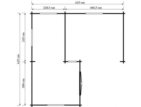 Grandcasa Classic Andros 635 x 635 cm Maatwerkmodel hoekblokhut met zadeldak. Gemaakt van  kwalitatief Noord-Europees vurenhout. Inclusief: 1 Dubbele deur 3 Vleugelramen 1 Vast raam Dakbedekking shingels keuze uit vier kleuren rood, groen, zwart of bruin Nokhoogte 290 cm Wandbalk dikte: 33 mm