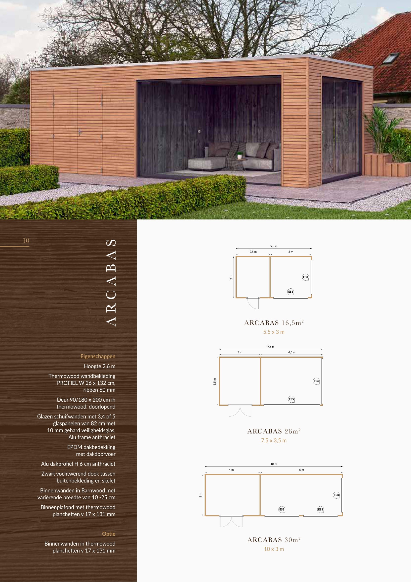 Wordt standaard geleverd met : – 2x Glazen schuifwand met 3/5 glaspanelen – Dubbele deur – Thermowood wandbekleding – Wandbekleding lounge Barnwood – Benodigde bevestigingsmaterialen – zwart vochtwerend doek – EPDM dakbedekking met dakdoorvoer – Hoogte 2,6 meter