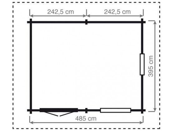 Grandcasa Classic Athos 395 x 485 cm Maatwerkmodel blokhut met lessenaarsdak. Gemaakt van kwalitatief Noord-Europees vurenhout. Inclusief: 1 Dubbele deur 1 Vast ramen 1 Vleugelraam Dakbedekking shingels keuze uit vier kleuren rood, groen, zwart of bruin Nokhoogte 287 cm Wandbalk dikte: 33 mm