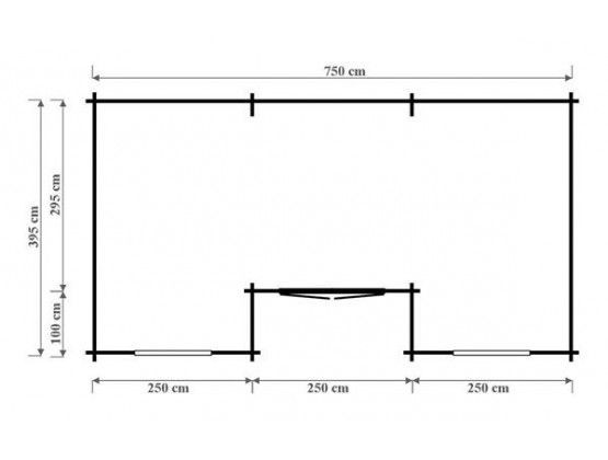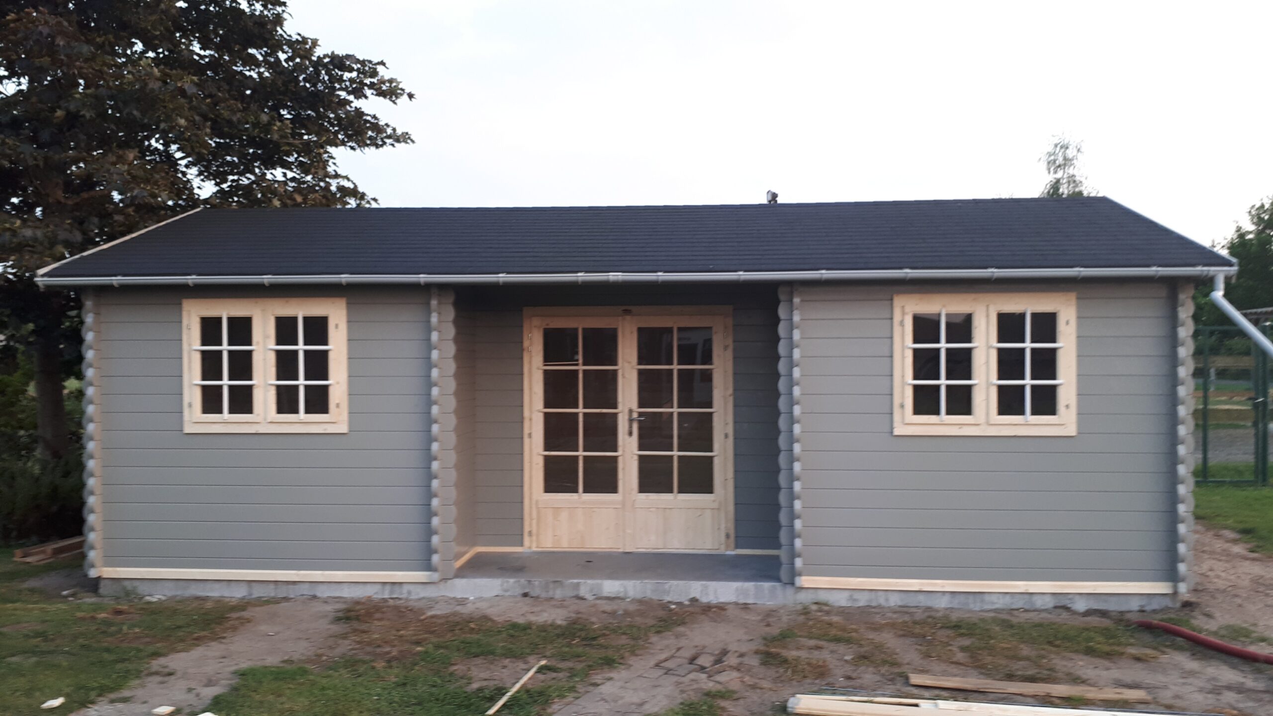 Grandcasa Classic Belize 750 x 395 cm Maatwerkmodel met zadeldak en inpandige luifel. Gemaakt van  kwalitatief Noord-Europees vurenhout. Inclusief: 1 Dubbele deur 2 vleugelramen Dakbedekking shingels keuze uit vier kleuren: rood, groen, zwart of bruin Nokhoogte 290 cm Wandbalk dikte: 33 mm