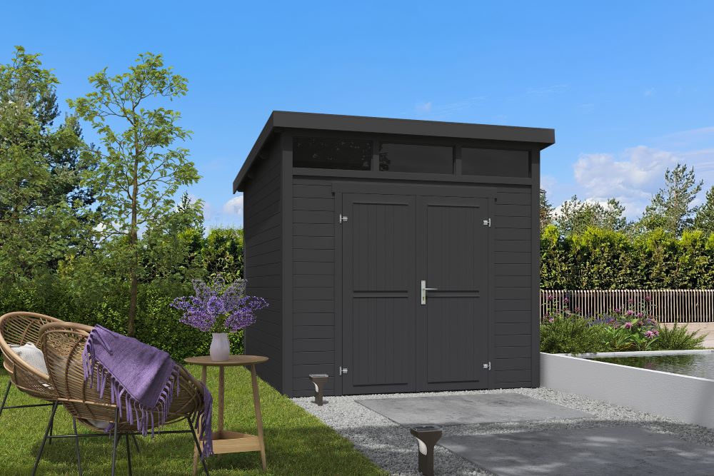 Berging Kibo 3 – 250 x 250 cm Inclusief: Hang- en sluitwerk Dubbele blinde deur Vast raam voorzien van 1,5 mm PE-kunststof helder glas Stormankers Montagehandleiding Exclusief: Dakbedekking- zie optie EPDM Gratis thuisbezorgd