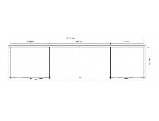 Blokhut Grandcasa maatwerk Cézanne strake en moderne blokhut met overkapping van blank en onbehandeld Noord-Europees vuren. Afmeting: 1330 x 300 cm Houtdikte 33 mm Inclusief: 1 Dubbele deur 1 Enkele deur 1 Langwerpig raam 2 uitzetramen EPDM-folie Aluminium randafwerking (daktrim) PVC dakgootset Nokhoogte 228 cm