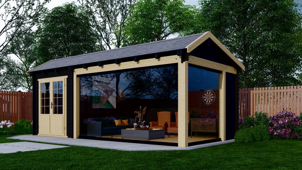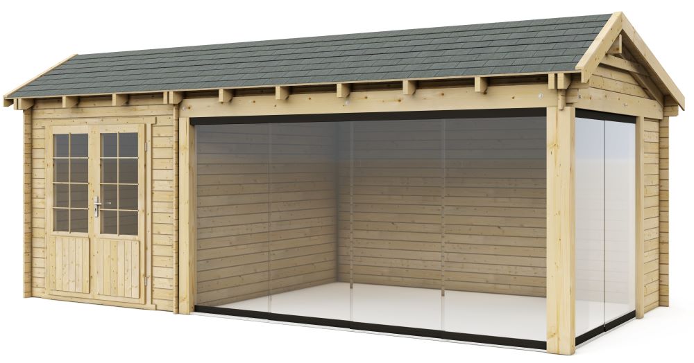 Het gesloten blokhutgedeelte heeft een afmeting van 225 x 300 cm en is voorzien van een dubbele deur met 3/4 glas. Dit zorgt niet alleen voor een elegante uitstraling, maar ook voor veel natuurlijk licht in het interieur. Hierdoor voelt de ruimte ruim en comfortabel aan.