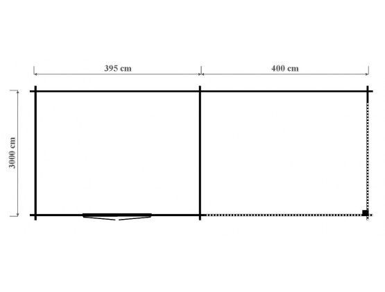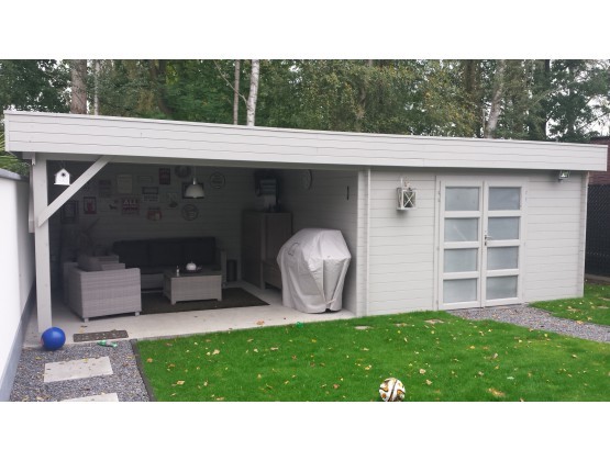 Blokhut Grandcasa maatwerk Mimas 800 Strakke en moderne blokhut met overkapping van blank en onbehandeld Noord-Europees vuren. Afmeting: 795 x 300 cm Houtdikte 33 mm Inclusief: Dubbele deur EPDM-folie Aluminium randafwerking (daktrim) PVC dakgootset Nokhoogte 228 cm