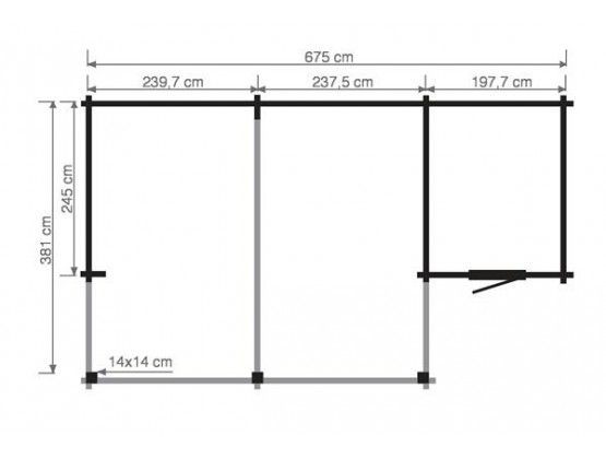 Blokhut Grandcasa maatwerk Mimas Sharon Strakke en moderne blokhut met overkapping van blank en onbehandeld Noord-Europees vuren. Afmeting: 675 x 395 cm Houtdikte 33 mm Inclusief: Vol houten enkele deur EPDM-folie Aluminium randafwerking (daktrim) PVC dakgootset Nokhoogte 241 cm