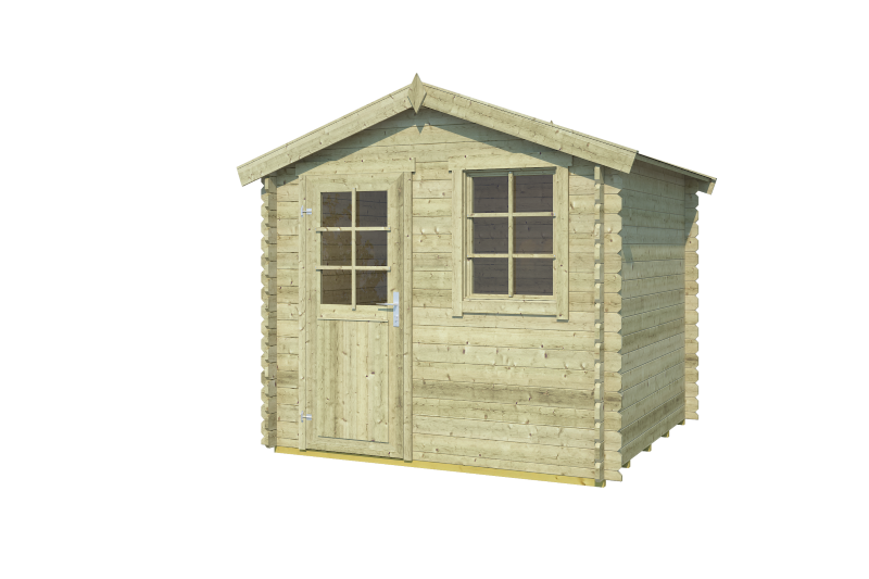 De blokhut heeft een buitenmaat van ongeveer 230 x 230 cm, waardoor hij compact blijft maar toch voldoende ruimte biedt voor opslag of hobbygebruik.