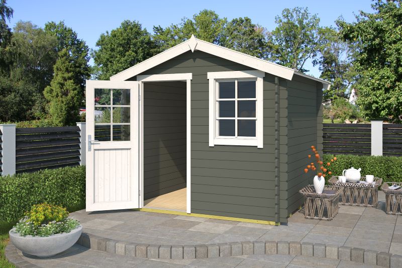 Het model heeft een traditioneel zadeldak, wat niet alleen zorgt voor een charmante uitstraling, maar ook voor een efficiënte afwatering van regenwater. De blokhut is uitgerust met een enkele deur en een praktisch draai-kiepraam, waardoor er voldoende licht en ventilatie in de ruimte komt.