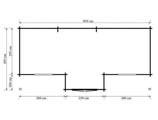 Grandcasa Classic Cartagena 850 x 395 cm Maatwerkmodel met zadeldak en luifel. Gemaakt van kwalitatief Noord-Europees vurenhout. Inclusief: 1 Dubbele deur 2 vleugelramen Dakbedekking shingels keuze uit vier kleuren rood groen zwart of bruin Nokhoogte 290 cm Wandbalk dikte: 33 mm