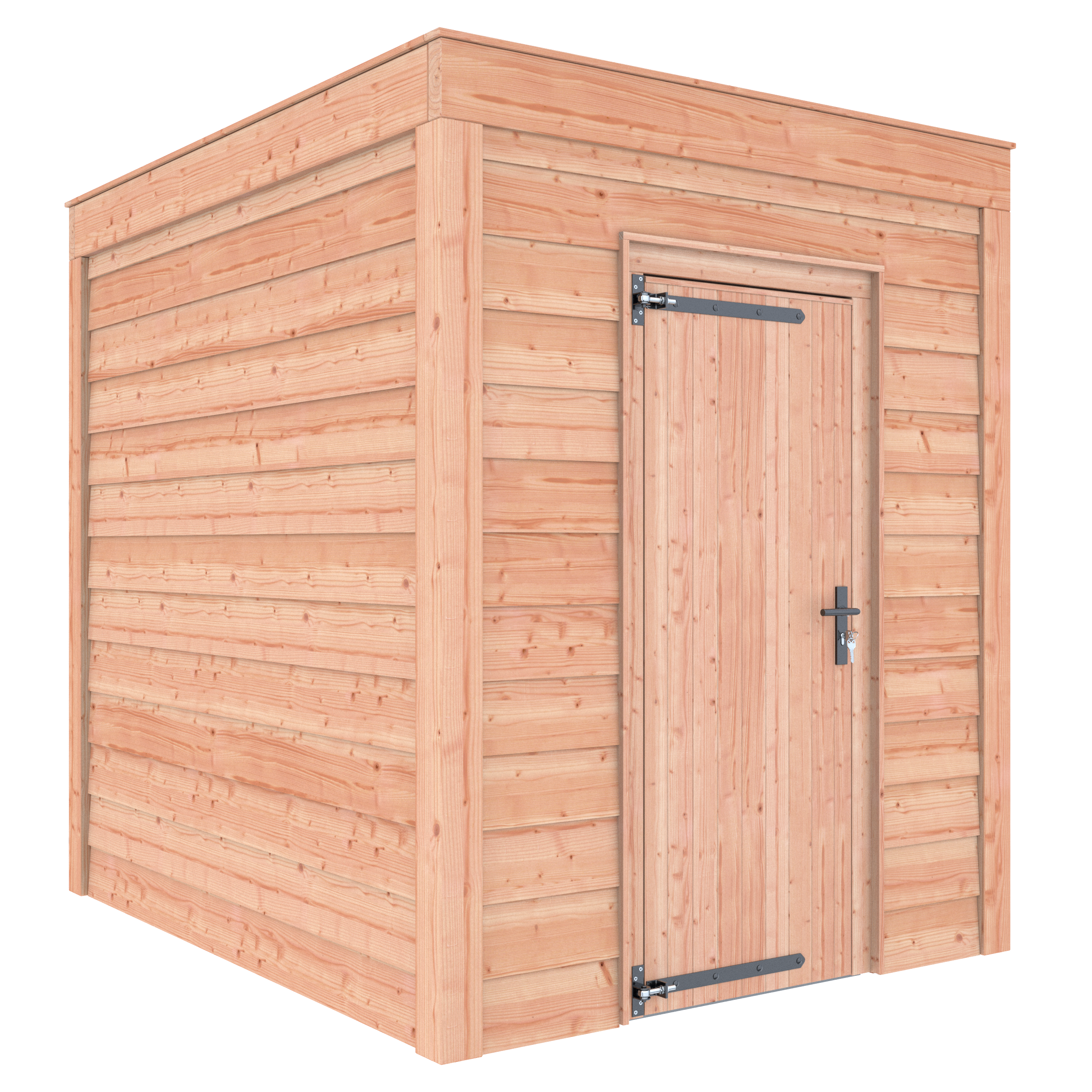 De Douglas berging heeft een fundamentmaat van 202,5 x 252,5 cm, een royale deuropening van 190 x 72 cm en een nokhoogte van 244,8 cm. De constructie is opgebouwd uit onbehandeld Douglas hout met sterke staanders van 12×12 cm, wat zorgt voor een duurzame en solide basis. De wanden zijn afgewerkt met Douglas Zweeds rabat, wat niet alleen stevig is, maar ook een warme, natuurlijke uitstraling geeft.