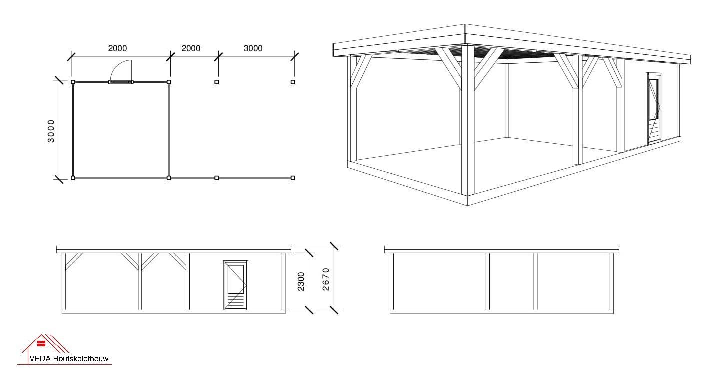 Douglas tuinhuis Moud 3 – 700 x 300 cm – Robuuste uitvoering Productie: VEDA Houtskeletbouw Enkele deur met venster Overkapping van 500 cm Douglas palen geschaafd 14 x 14 cm Wanden enkelzijdig Zweeds rabat blank EPDM-folie en dak doorvoer Regenpijp tot maaiveld Prijs is inclusief montage tuinhuis Graag zelf de montage uitvoeren? Vraag ons naar de mogelijkheden en uw prijsvoordeel.