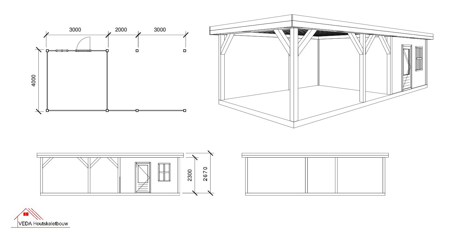 Douglas tuinhuis Saar 3 – 800 x 400 cm – Robuuste uitstraling Productie: VEDA Houtskeletbouw Enkele deur met venster Enkel uitzetraam Overkapping van 500 cm Douglas palen geschaafd 14 x 14 cm EPDM-folie en dak doorvoer Regenpijp tot maaiveld Prijs is inclusief montage tuinhuis Graag zelf de montage uitvoeren? Vraag ons naar de mogelijkheden en uw prijsvoordeel.