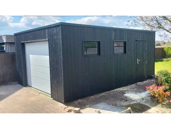 Ontdek deze moderne garage, opgebouwd uit stevige houten frames met een verticale bekleding van zwarte, drukgeïmpregneerde vuren planken (21 x 139 mm). De elegante zwarte afwerking zorgt voor een tijdloze uitstraling die perfect past in elke tuin.