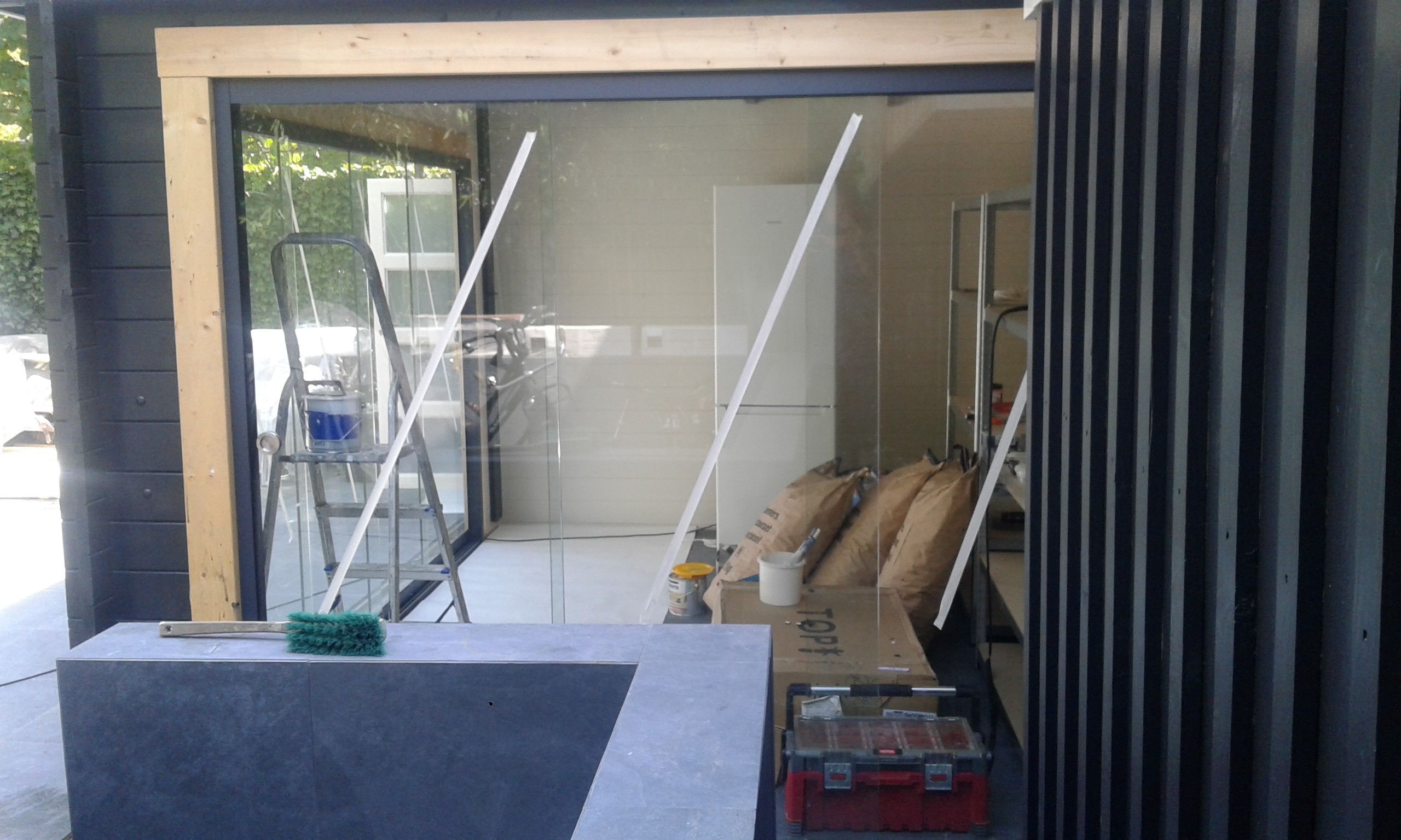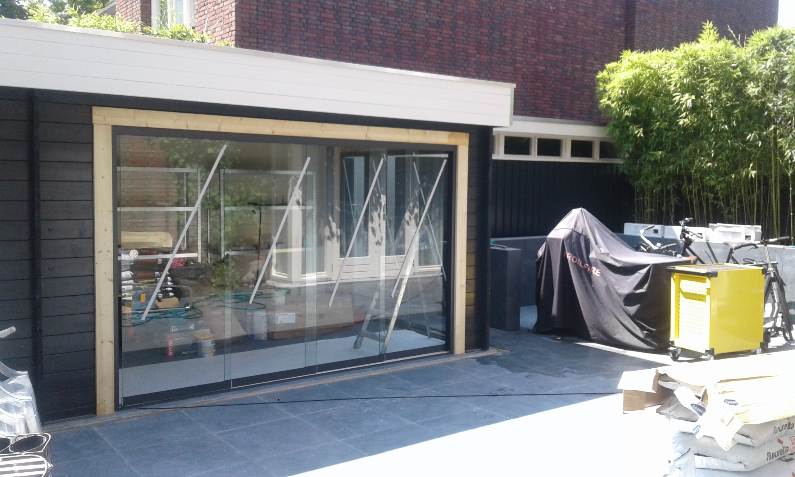 Door de glas schuiframen ontstaat er een prachtige tuinkamer. Zo kunt u het hele jaar door genieten van uw tuin, ongeacht het weer. Het platte dak is voorzien van een slimme afloop, waardoor het water aan de achterzijde wordt afgevoerd met de standaard bijgeleverde dakgootset.