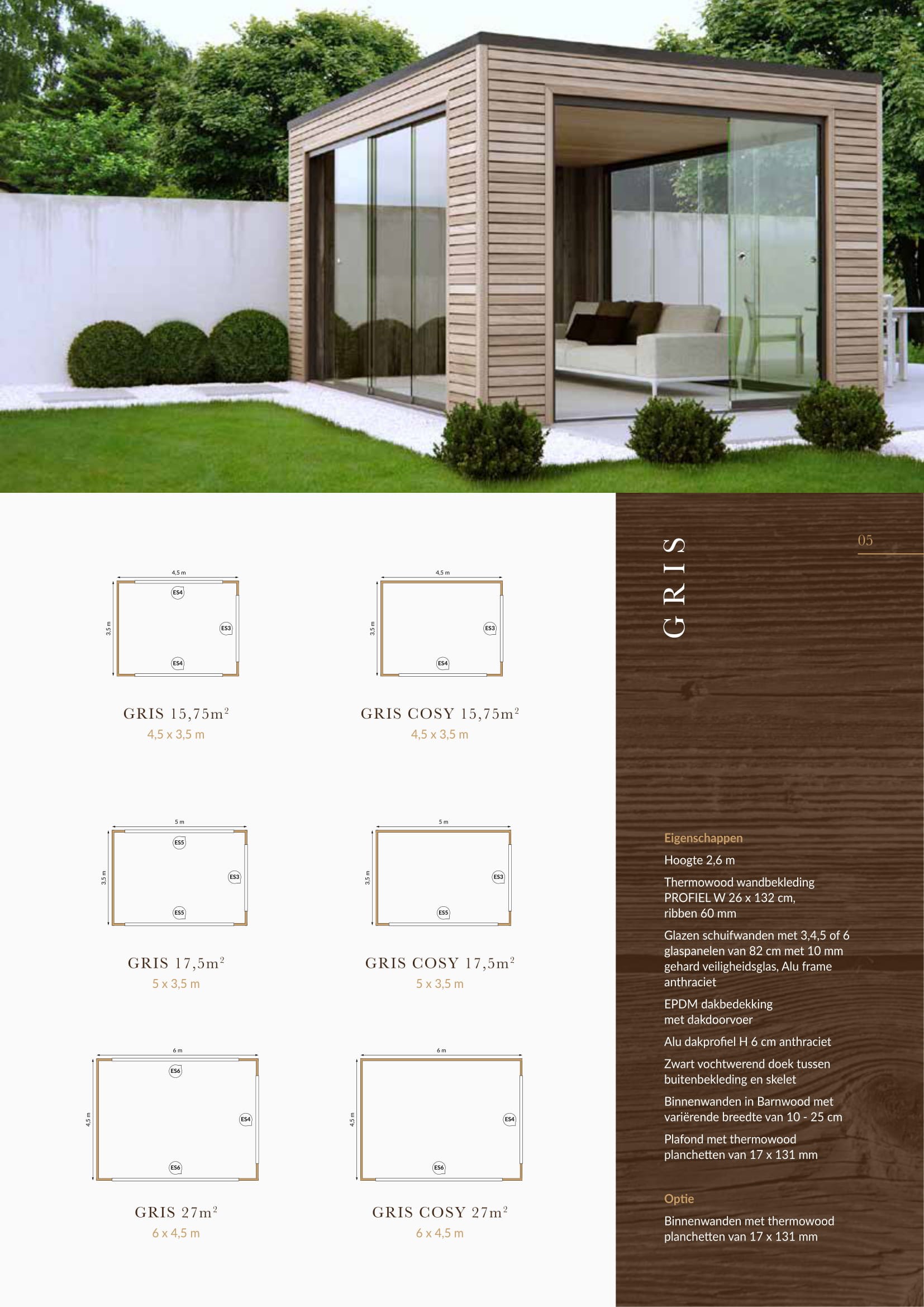 Thermowood wordt verkregen door naaldhout thermisch te verwarmen tot minimaal 215°C. Hiervoor wordt stoom gebruikt om scheuren en barsten in het hout tegen te gaan, waardoor eveneens de typische rookgeur ontstaat. De buitenwanddelen zijn 26 x 132 cm met ribben van 60 mm. De afmeting van de planchetten is 17 x 131 mm. Na deze behandeling is thermohout te vergelijken met tropisch hardhout van klasse I. Ons thermohout heeft een aantrekkelijke warme kleur welke na een tijdje mooi en egaal vergrijst.