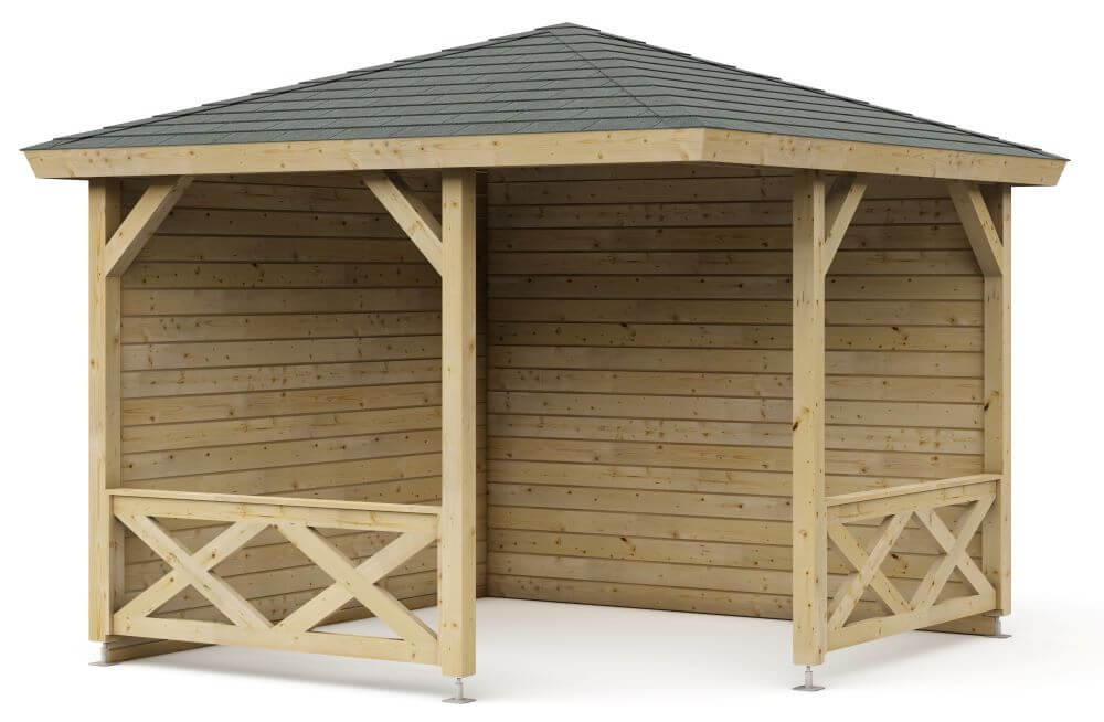 Het paviljoen is uitgevoerd met een massief gekruist hekwerk, wat niet alleen zorgt voor extra stevigheid maar ook voor een klassieke, stijlvolle uitstraling. De constructie staat op sterke 9 x 9 cm palen, compleet geleverd inclusief stelvoeten en schoren voor optimale stabiliteit.