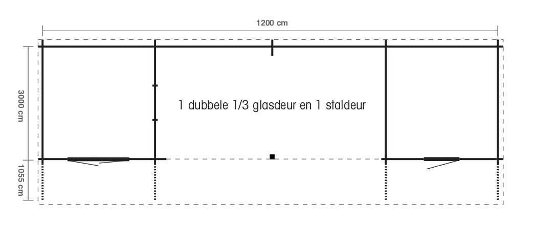 Kapschuur Brehat 1200 x 300 cm Luxe kapschuur met asymetrisch zadeldak Inclusief: 2 x berging 300 x 300 cm 1 x dubbele deur 1 x raam 1 x staldeur Dakshingels keuze uit vier kleuren Wandbalk dikte: 33 mm Steunpaal van 14 x 14 cm Noord-Europees vuren