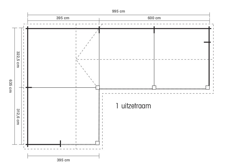 Kapschuur Callot 995 x 635 cm Luxe kapschuur met asymetrisch zadeldak Inclusief: 1x uitzetraam Dakshingels keuze uit vier kleuren Wandbalk dikte: 45 mm Steunpaal van 14 x 14 cm Noord-Europees vurenhout