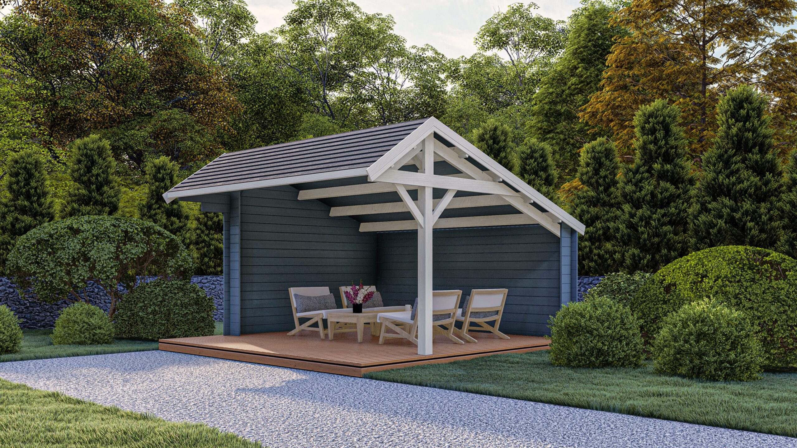 Deze kapschuur is uitgerust met twee gesloten achterwanden en een asymmetrisch zadeldak, wat bijdraagt aan de aantrekkelijke en robuuste vormgeving.