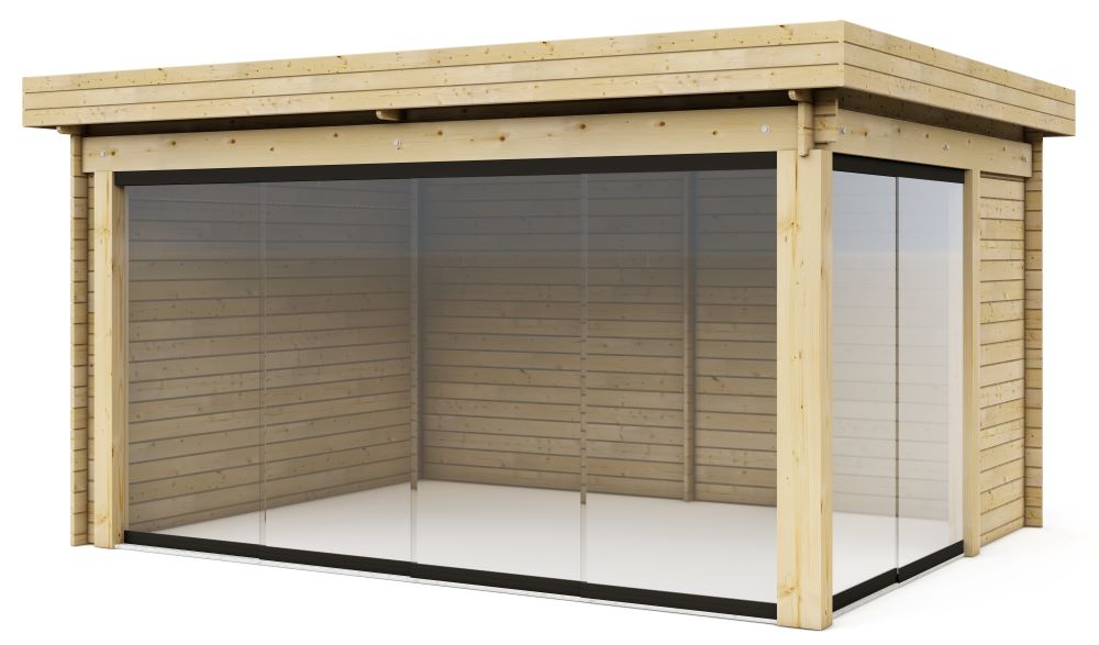 De Interflex overkapping G4434 kan worden uitgebreid met glazen schuifwanden (niet standaard inbegrepen). Deze schuifwanden zorgen ervoor dat u beschut zit tegen wind en regen, terwijl u toch geniet van een open en lichte uitstraling.