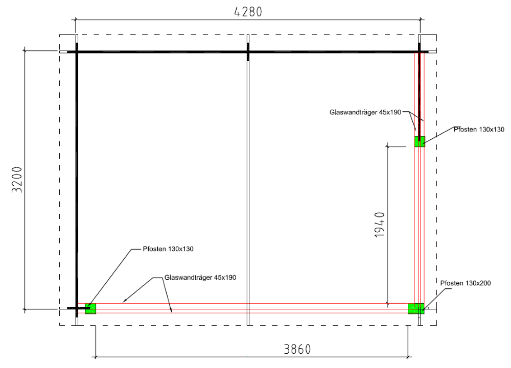 De Interflex G4434 heeft een buitenmaat van 448 cm breed en 340 cm diep. De wandhoogte bedraagt 250 tot 257 cm, waardoor u een ruimtelijk gevoel onder de overkapping krijgt.