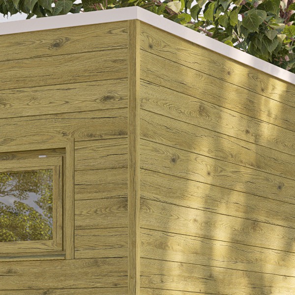 Deze constructie is vervaardigd uit zwarte, drukgeïmpregneerde vurenhouten planken van 21 x 139 mm, bevestigd op een houten frame. Dit model is tevens verkrijgbaar met wandbekleding in het groen of wit. Let op: de richting van de wandbekleding is vast en kan niet worden aangepast.
