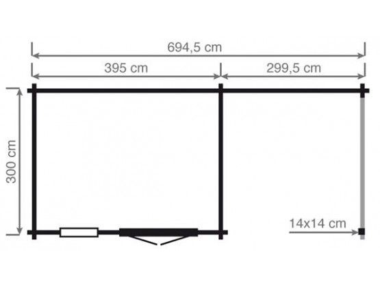 Tuinhuis Grandcasa Castel met overkapping Tuinhuis in Engelse Cottage & Country stijl van blank en onbehandeld Noord-Europees vuren. Afmeting: 685 x 300 cm Houtdikte 33 mm Inclusief: 1 Dubbele deur 1 Uitzetraam Wolfsdak Dakbedekking shingels kleur naar keuze Nokhoogte 350 cm