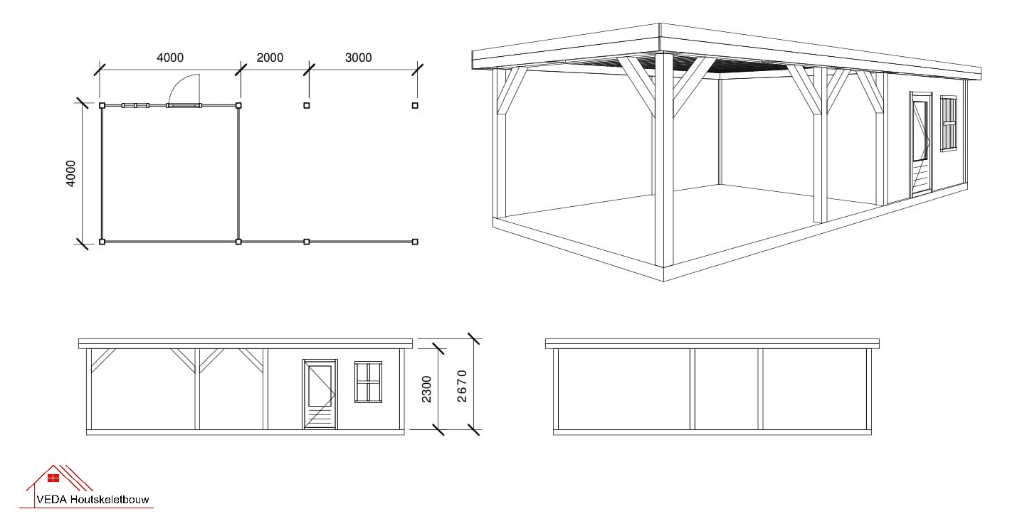 Douglas tuinhuis Diana 3 – 900 x 400 cm – Robuuste uitstraling Productie: VEDA Houtskeletbouw Enkele deur met venster Enkel uitzetraam Overkapping 500 x 400 cm Douglas palen geschaafd 14 x 14 cm Wanden enkelzijdig Zweeds rabat blank EPDM-folie en dak doorvoer Regenpijp tot maaiveld Prijs is inclusief montage tuinhuis Graag zelf de montage uitvoeren? Vraag ons naar de mogelijkheden en uw prijsvoordeel.