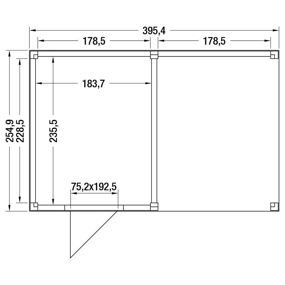 Het tuinverblijf heeft een totale afmeting van 244,8 cm hoog, 395,4 cm breed en 254,9 cm diep.