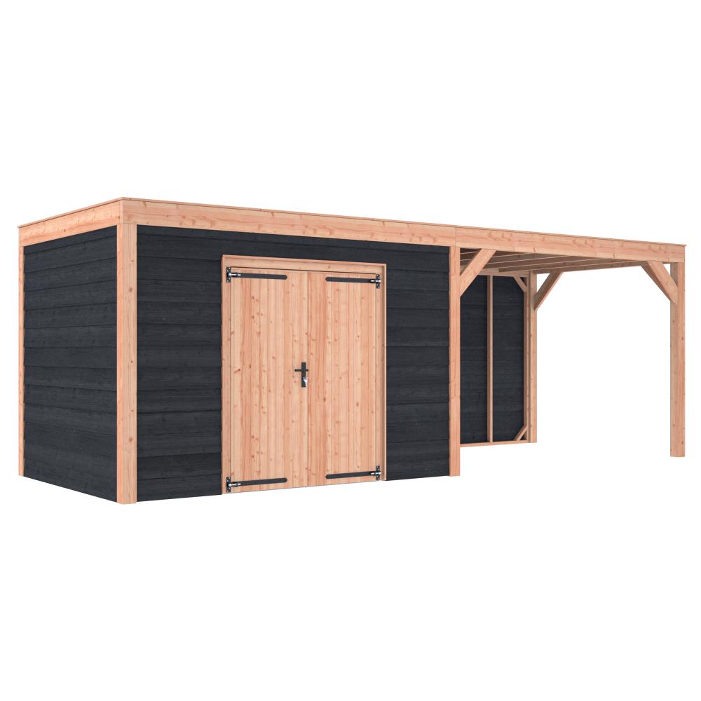 Tuinhuis met overkapping Douglas zweeds rabat zwart 700 x 250 cm