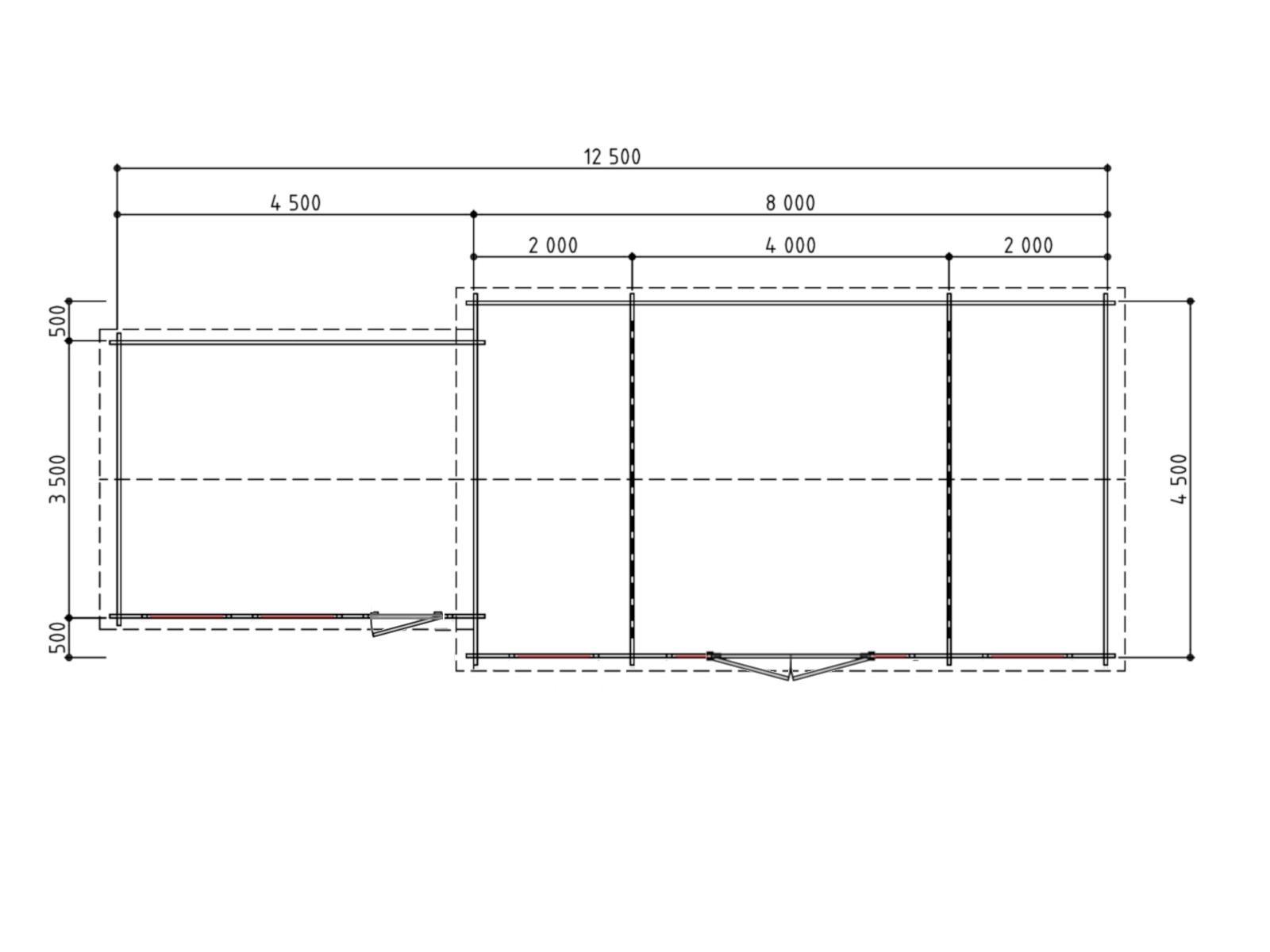 Het hoofdgedeelte van de Ruskin meet 800 cm breed en 450 cm diep, waardoor het een ruime plek biedt voor verschillende toepassingen zoals een ontspanningsruimte, hobbyruimte of tuinkantoor. Aan de linkerkant is een kleiner, harmonieus aansluitend gedeelte van 450 x 350 cm geplaatst. Deze indeling maakt het mogelijk om de ruimte flexibel te gebruiken en biedt tegelijkertijd een esthetisch aantrekkelijk geheel dat perfect past in een landelijke of klassieke tuinsetting.
