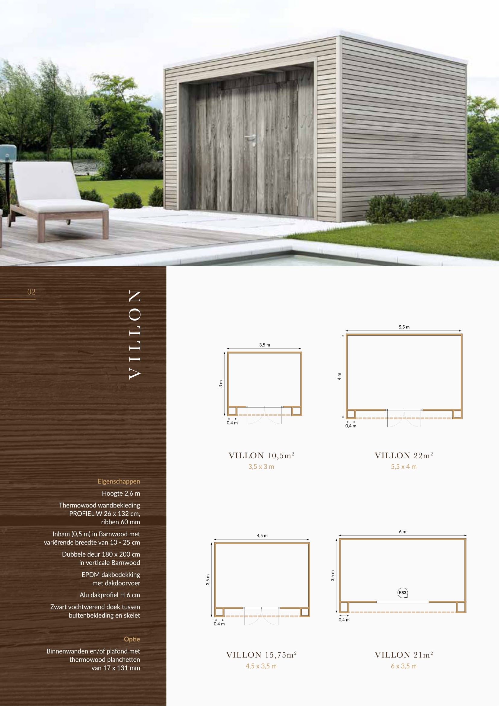 Moderne, onderhoudsvrije berging in houtskeletbouw bekleed met hoogkwalitatieve thermowood beplanking van 26 mm dikte. Deze constructie heeft een dubbele deur met RVS deurbeslag. Het dak is voorzien van zware dakbalken, een plafond van waterbestendige OSB platen en bedekt met hoogwaardig EPDM-rubberen dakbedekking. Dakafwerking met aluminium dakprofielen.